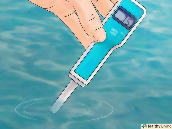 Наберіть воду для проби правильним чином. підготуйте чисту банку або пляшку, поверніть її отвором вниз до води. Плавно занурте ємність у воду і переверніть, щоб набрати води. Не набирайте воду біля стоку або місця надходження води в басейн. Найкраще брати воду з середини басейну. Якщо це неможливо, постарайтеся вибрати місце, максимально близьке до середини, щоб результати вимірювань були максимально точними. [3]