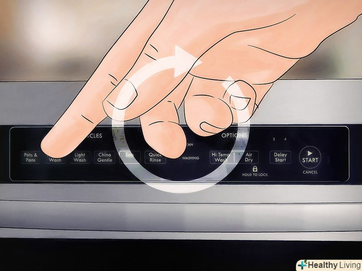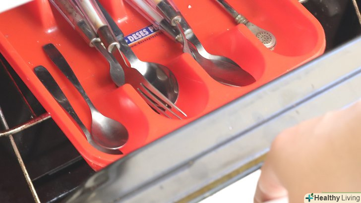 Помістіть столові прилади в посудомийну машину. виставте на посудомийній машині такий режим, який найкраще підходить для даної посуду. У більшості випадків досить буде звичайного циклу, але якщо прилади сильно забруднені, може знадобитися посилений режим. Вимкніть цикл сушіння, якщо є така можливість. [5] після цього додайте відповідний миючий засіб, закрийте дверцята і запустіть посудомийну машину.- Щоб потім було простіше розсортувати столові прилади, можна розкласти ложки, виделки і ножі в окремих місцях посудомийної машини.