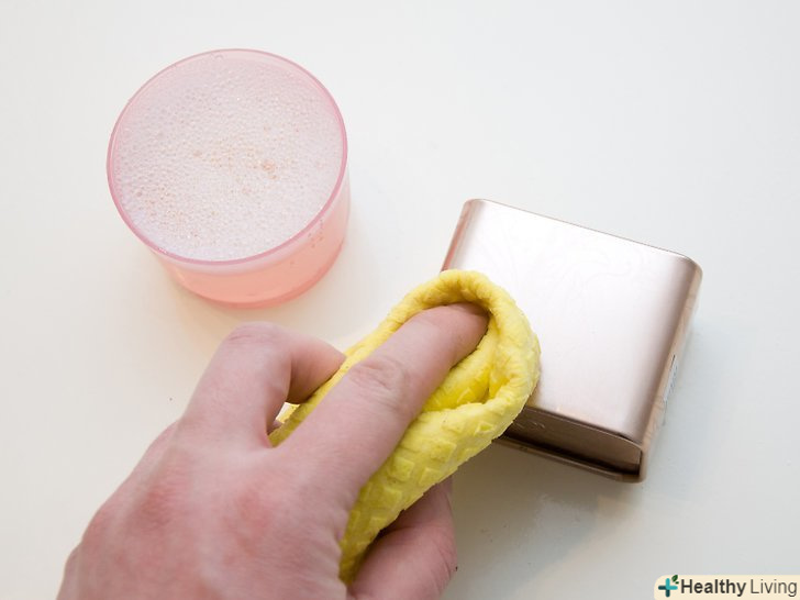 Очистіть нелаковану поверхню. умочіть м'яку бавовняну ганчірку в суміш з теплої води і м'якого засобу для миття посуду, відіжміть ганчірку, щоб вона стала просто вологою, і акуратно протріть виріб. [27]- Можна використовувати стару зубну щітку, якщо вам потрібно очистити важкодоступні місця і щілини.