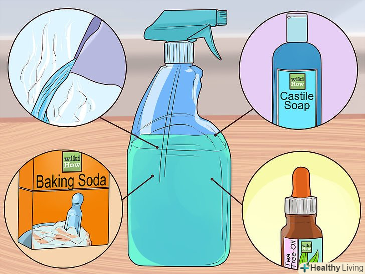 Приготуйте натуральний чистячий розчин. якщо у вас немає бажання йти в магазин, то зробіть просте універсальне засіб для чищення своїми руками. Змішайте теплу воду, харчову соду, рідке мило і ефірне масло, після чого додайте розчин в розпилювач. Всі компоненти є практично в будь-якому будинку. Вони безпечні, але досить ефективні. Нанесіть готовий розчин на брудну поверхню і залиште на кілька хвилин, а потім видаліть плями чистою губкою. [10]- Якщо у вас немає рідкого мила, то замініть його перекисом водню.