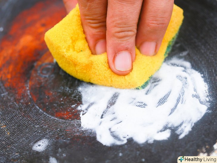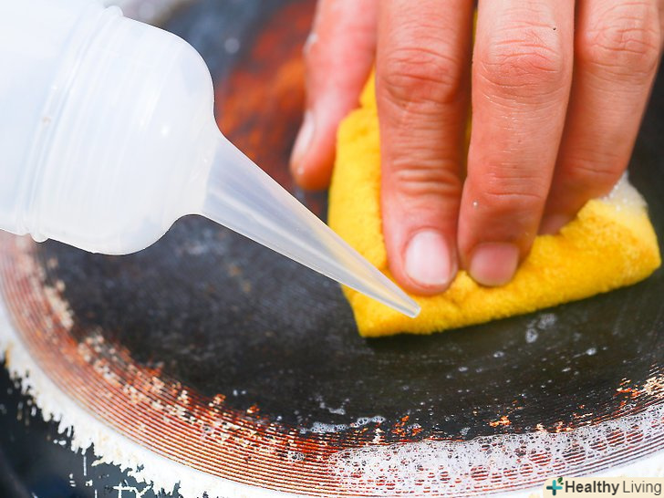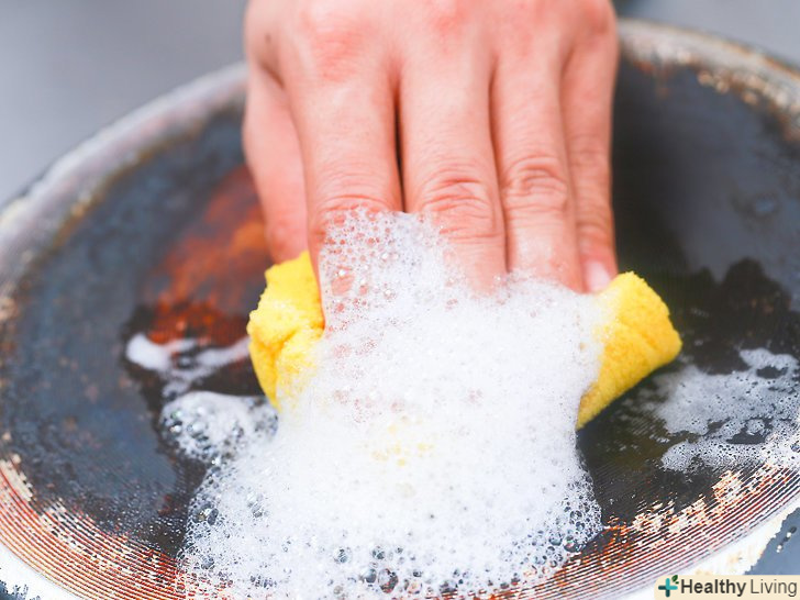 Почніть шкребти сковороду. додайте гарячу мильну воду, коли стара охолоне. Тріть тим, що не зашкодить матеріал сковороди:- Емаль, анодований алюміній або тефлон: візьміть губку, нейлонову щітку або меламінову губку (губка із захисною пластиковою сіткою).