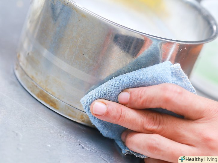 - Сковороди з нержавіючої сталі, міді або не анодованого (блискучого) алюмінію: почніть з більш м'яких варіантів, зазначених вище, а потім скористайтеся залізною або мідною мочалкою. Не натискайте занадто сильно і тріть під водою, щоб звести кількість подряпин до мінімуму. [4]
