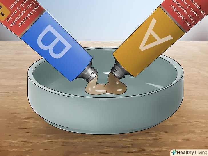 Тут же розмішайте клей. Візьміть ложечку або паличку для помішування і швидко розмішайте компоненти епоксидного клею разом з барвником. Через кілька секунд суміш стане схожа на фарбу, якою можна заповнити тріщину. [17]
