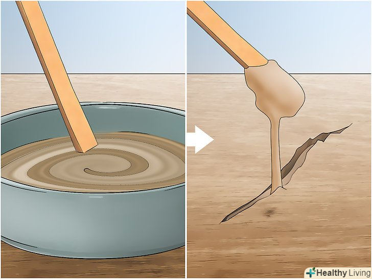 Пальцями втисніть замазку в отвір. Якщо ви використовуєте воскові палички, просто втирайте паличку в тріщину, а потім розмажте речовина пальцями. При роботі з мастикою можна скористатися шпателем або зубилом. Ними досить зручно розмазувати матеріал по тріщині. [2]