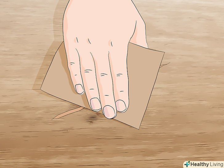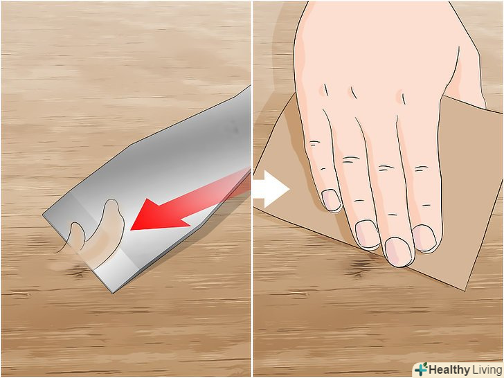 Відшліфуйте клей наждачним папером. спочатку візьміть шпатель і приберіть зайвий клей. Потім візьміть дрібнозернисту (P120 (10-H)–P220 (6-H)) наждачний папір або напилок і акуратно розрівняйте поверхню, поки вона не буде врівень з деревиною. [20]- Рубанком вам буде простіше це зробити, і під час шліфування ви не видалите частину деревини.