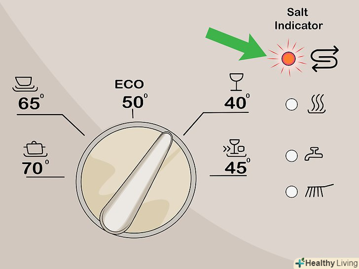 Перевірте індикатор солі. Посудомийні машини самі сповіщають, що в них потрібно досипати ще солі. У багатьох посудомийних машинах на верхній панелі і / або на самій машині є сигнальна лампочка. Якщо вона буде зеленою, значить, все добре. Якщо вона загориться червоним (або стане прозорою на самому пристрої), значить, необхідно насипати ще солі. [9]
