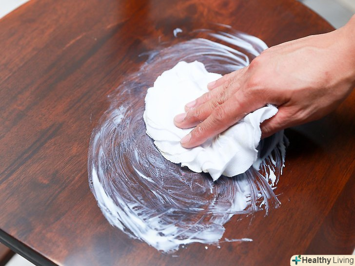 Обробіть деревину воском або поліроллю. після того, як Меблі буде ретельно протерта, необхідно захистити деревину шаром воску або поліролі. У будь-якому господарському магазині або супермаркеті можна знайти найрізноманітніші спреї і поліролі для деревини. Пошукайте такі засоби, в складі яких присутній захисне силіконове масло. Для полірування воском використовуйте тільки м'яку бавовняну серветку або спеціальну поліруючу щітку. Наносите віск на деревину по чуть-чуть і розтирайте його круговими рухами. [4]- Як тільки віск почне підсихати або мутнеть, Візьміть нову бавовняну ганчірочку або поліруючу щітку і відполіруйте оброблену воском поверхню, працюючи дрібними круговими рухами.