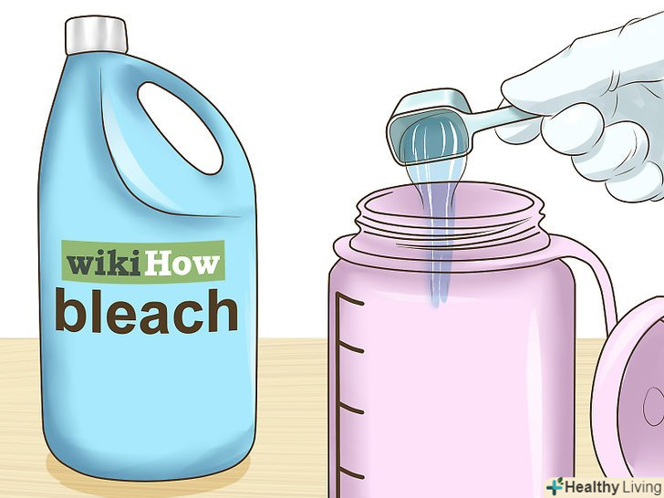Налийте відбілювач у пляшку. невелика кількість відбілювача вб'є будь-яку цвіль, яка розрослася всередині пляшки. [9] відміряйте приблизно половину чайної ложки відбілювача і вилийте його в пляшку.