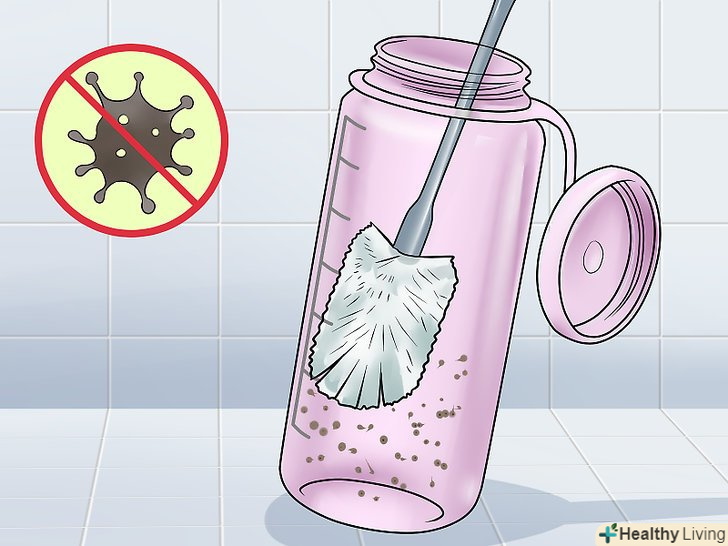 Тріть пляшку засобом для миття посуду. додайте трохи засобу у флягу і долийте води. Струсіть, щоб утворилася мильна піна, і чистим йоржиком для пляшок або губкою ретельно промийте її на всю глибину. Потім промийте, щоб вимити всю піну. [1]- Трохи миючого засобу для миття посуду ніяк не зашкодить, особливо якщо ви досить ретельно обполоснете пляшку, але замість нього також можна використовувати лимонний сік. [2]