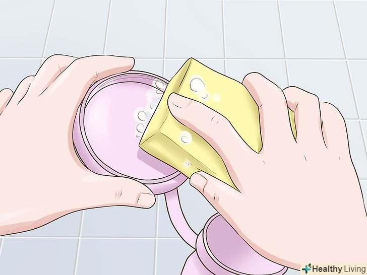 Протріть пластикову петлю і кришку. змоченою в мильному розчині губкою витріть пластикове кільце, яке обертається на шийці пляшки. Ретельно пройдіться йоржиком або губкою по кришці, щоб захопити всі її вигини. Ватним тампоном також можна обробити самі недоступні злами. Промийте під проточною водою обидві складові частини.