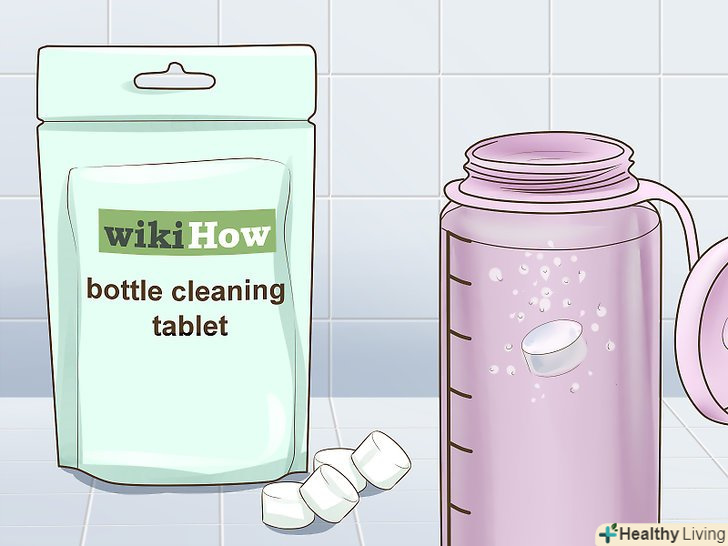 Використовуйте таблетку для чищення посуду. якщо необхідно продезінфікувати ємність, можна купити спеціальні таблетки. Їх зручно використовувати для чищення фляги, якщо ви розташувалися табором або подорожуєте пішки. Наповніть пляшку водою і киньте в неї таблетку. Потім почекайте близько години, перш ніж мити і сушити пляшку. [4]