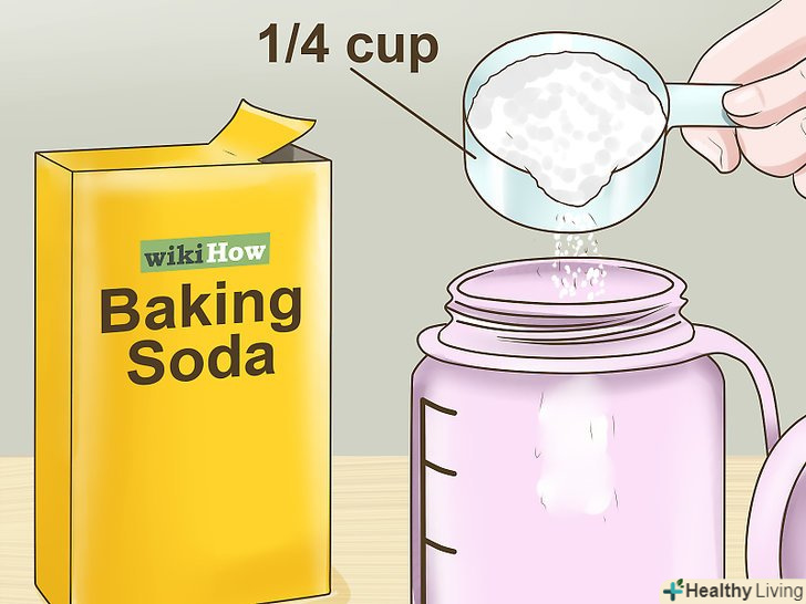 Насипте харчову соду в пляшку. харчова сода виводить незвичайні запахи і плями. Це особливо стане в нагоді в тому випадку, коли в пляшці зберігалася липка рідина, така як сік. Відміряйте одну чверть чашки харчової соди і насипте її в пляшку. [6]