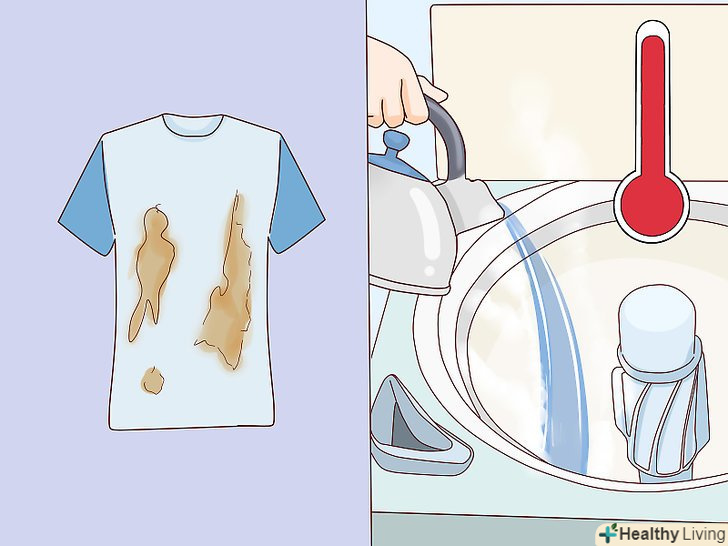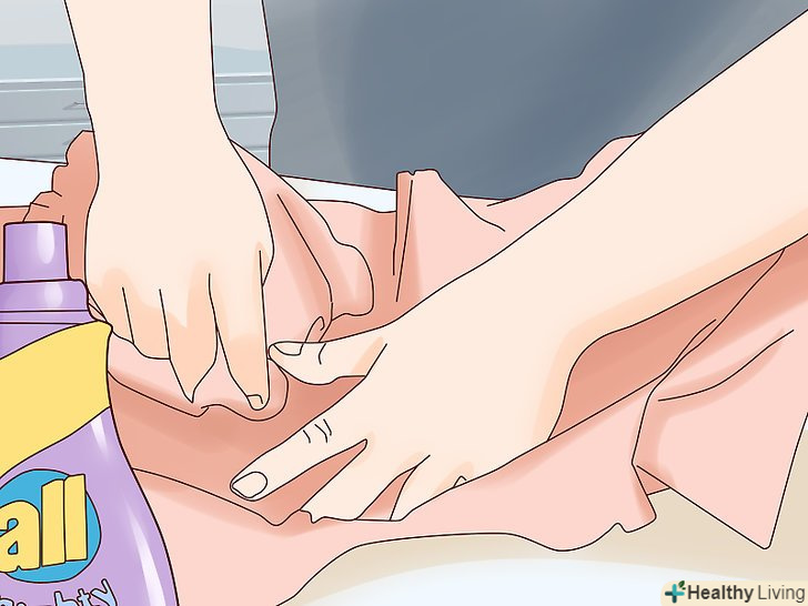 Намагайтеся негайно обробляти плями засобом для виведення плям або миючим засобом. найкращих результатів у видаленні плям можна домогтися в тому випадку, якщо займатися ними невідкладно. Як тільки у вас з'явиться можливість, нанесіть на пляму плямовивідник або просто рідкий засіб для прання і обережно втирайте в забруднене місце. Залиште засіб впливати на пляму мінімум на 5 хвилин, перш ніж прати річ. [5]- Також для видалення плям можна попередньо замочувати речі на 30 хвилин в холодній воді перед пранням. Для цього використовуйте великий таз, раковину або ж додаткову опцію замочування в пральній машині.