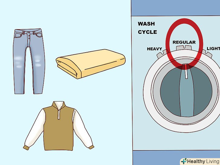 Використовуйте цикл звичайного прання для речей з міцних тканин. звичайна програма прання часто має на увазі досить швидке обертання барабана при пранні і віджиманні. Це ідеально підходить для речей з міцних тканин, наприклад, джинсів, толстовок і рушників. [12]- Також звичайний цикл прання добре підходить для дуже брудного одягу. Тільки стежте за тим, щоб не застосовувати його для делікатних речей з тонких тканин і одягу з прикрасами.