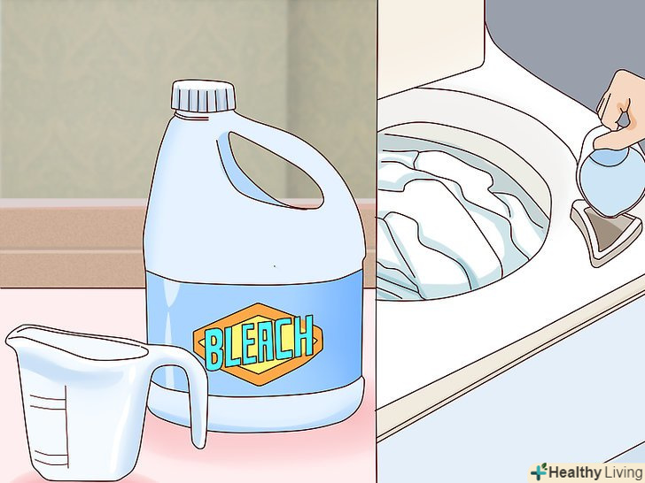 Додайте відбілювач до білих речей, щоб зберегти їх білий колір. знайдіть відсік для відбілювача. Зазвичай він розташовується поруч з відсіком для миючого засобу в машинах з переднім завантаженням і збоку у верхній частині бака у машин з вертикальним завантаженням. Прочитайте інструкції до свого відбілювача, щоб знати, в якій кількості додавати його на той обсяг білизни, який ви перете. [9]- Деякі відбілювачі без вмісту хлору безпечні і для кольорових тканин, тому їх можна використовувати з кольоровими речами, щоб освіжити їх кольору.