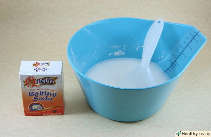 Приготуйте розчин харчової соди. щоб приготувати розчин, змішайте у великій мисці харчову соду з холодною водою в пропорції 1 до 2.- Хімічні властивості харчової соди роблять її ефективним і цілком доступним засобом для видалення плям. [4]