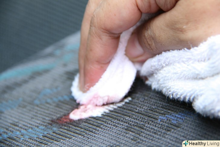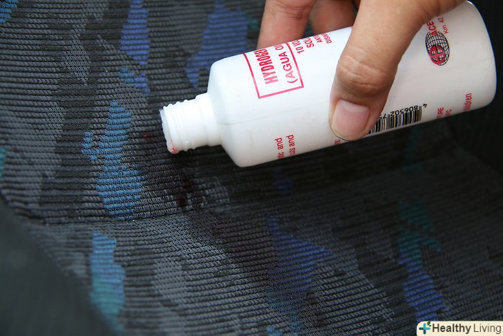 Нанесіть перекис водню прямо на пляму крові. змочіть забруднене місце тривідсотковим перекисом водню і залиште на 30 секунд. Уважно стежте за часом, так як більш довгий час контакту перекису з тканиною може пошкодити її. [8]- Незважаючи на вкрай високу ефективність у видаленні плям крові, перекис водню слід використовувати тільки в якості останнього засобу. Вона володіє відбілюючим ефектом і може послабити волокна тканини, а в деяких випадках і знебарвити їх. Перш ніж видаляти пляму перекисом, перевірте її вплив на тканину на невеликому непомітному ділянці оббивки. [9]