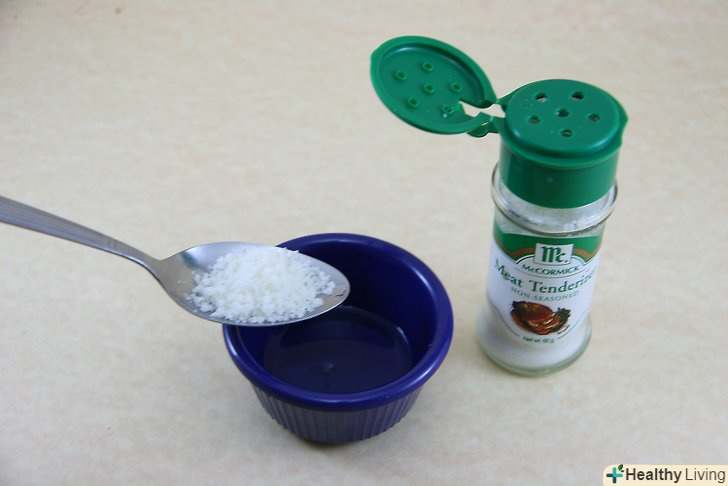 Приготуйте чистячий розчин. змішайте в невеликій мисці до утворення пасти 1 столову ложку размягчителя м'яса і 2 чайні ложки холодної води. [6] змішувати інгредієнти слід ретельно, щоб паста придбала однорідну консистенцію.- Розм'якшувач м'яса – відмінний засіб для видалення застарілих плям крові. Він розщеплює білки крові і тому ефективно бореться з такими плямами. [7]