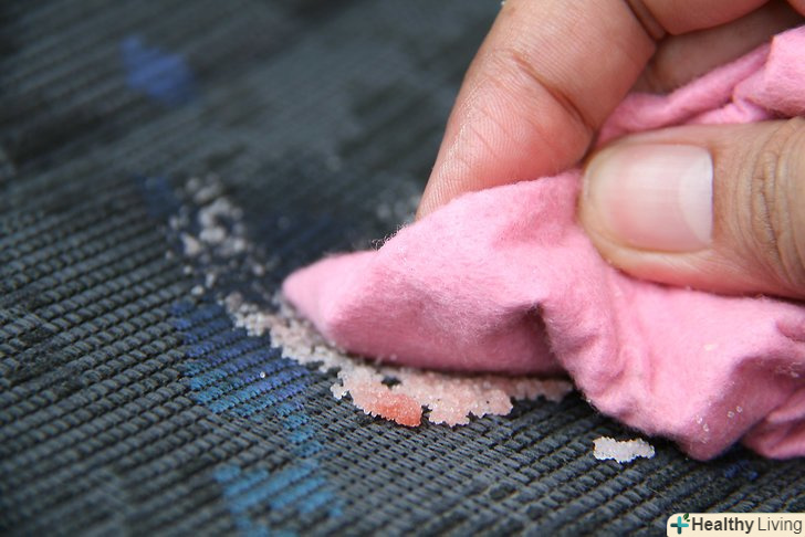 Збризніть пляму сольовим розчином. якщо у вас немає пульверизатора, просто змочіть в розчині чисту білу ганчірочку, а потім промакніте нею пляма (якщо необхідно, поміняйте ганчірочку).- Коли працюєте з великими плямами, рухайтеся від країв до центру. Так пляма не пошириться.