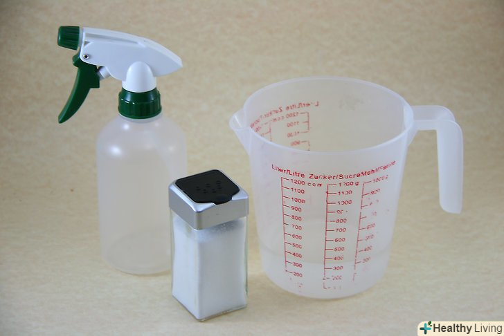 Приготуйте сольовий розчин. змішайте 2 чайні ложки солі з 240 мл холодної води і залийте цей розчин в пульверизатор. Гаряча і навіть тепла вода може назавжди закріпити пляму на тканинній оббивці, тому обов'язково використовуйте саме холодну воду, щоб приготувати розчин для обробки плями. [2]