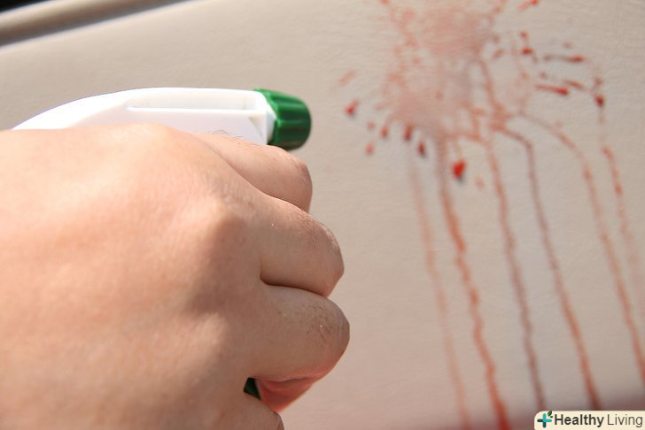 Нанесіть розчин на пляму. розпиліть розчин на пляму крові і залиште на 5 хвилин. Це дозволить розчину вбратися в пляму і краще його розчинити.