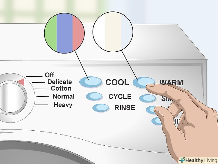 Розділіть речі перед пранням. при пранні потрібно мати на увазі дві речі: колір одягу і матеріал, з якого вона зроблена. Не всі тканини розраховані на однаковий тиск води або Швидкість віджиму.- Відокремте темні речі від світлих. При пранні речей, особливо нових, фарба з них може сходити — речі линяють (саме тому старі речі виглядають не такими яскравими, як нові). Одяг білого кольору, кремових, світлих і пастельних тонів слід відкласти в купку "світле", а всі інші — в "темну" купку. Якщо ви не розділите речі, ваша нова синя сорочка може злиняти і пофарбувати всі світлі речі в блакитний колір.