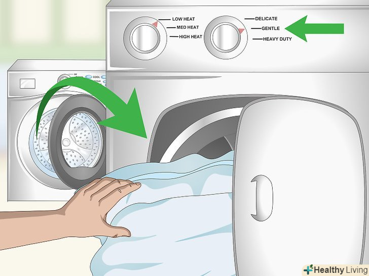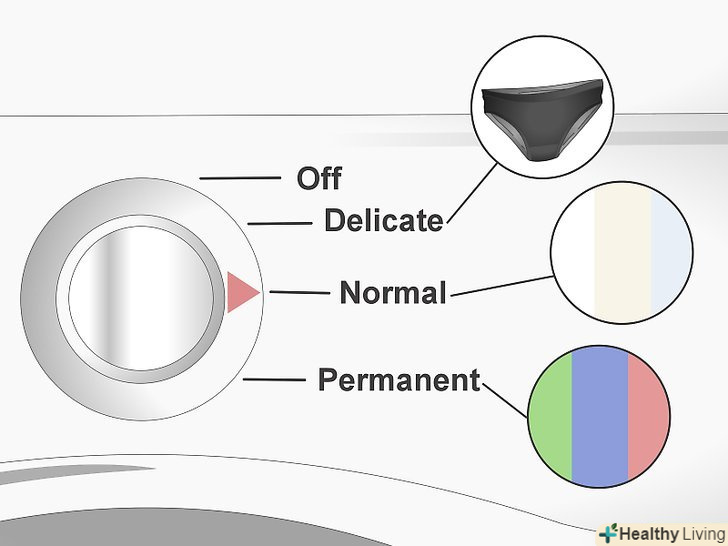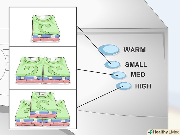 Перекладіть білизну в сушарку і виберіть потрібний цикл сушіння. зверніть увагу, що деякі речі слід сушити на повітрі. Перевірте бирку - якщо на ній написано "не сушити в сушарці" (або стоїть відповідний символ) — просто розвісьте річ, щоб вона висохла. Як і в пралках, в сушарках є цикли сушіння речей. Додайте лист пом'якшувача і закрийте люк. [3]- Звичайний / інтенсивний: Цикл найкраще підходить для сушіння білих речей. Білі речі, як правило, проходять попередню обробку і не сідають при пранні, тому нормально переносять більш інтенсивну сушку при високій температурі (на відміну від кольорових речей, які будуть вигоряти від сильного тепла).
