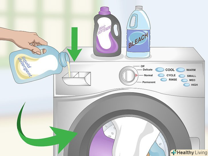 Додайте рідкий засіб для прання і закрийте люк машини. рідкі засоби для прання включають в себе миючий засіб, відбілювач і пом'якшувач для тканини. Можете скласти речі в машину і зверху вилити на них засіб для прання, або заповнити машину на третину водою, влити засіб в машину і потім покласти речі (не підходить для машин з фронтальним завантаженням). [2]- Засіб для прання: потрібну кількість засобу для прання залежить від обсягу завантаження машини. Зазвичай, на відсіку для засобу є маркування, скільки його потрібно наливати (насипати) або його можна відміряти мірною чашкою. Як правило, для малого завантаження потрібно ⅓ чашки, ⅔ - для середнього завантаження, і ціла чашка для великої. Проте, зверніть увагу на інструкції на упаковці засобу для прання — є засоби-концентрати, яких потрібно набагато менше, ніж зазвичай.