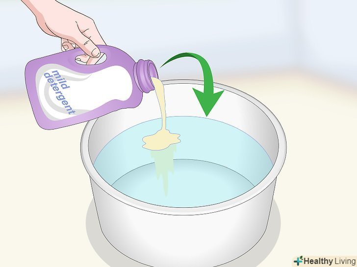 Додайте м'який миючий засіб для прання. засіб для ручного прання відрізняється від тих, що використовуються при машинному пранні. Звичайні засоби занадто концентровані і не підходять для ручного прання. М'які засоби для ручного прання можна купити там же, де і всі інші засоби — в будь-якому магазині побутової хімії. Просто переконайтеся, що на упаковці зазначено, що засіб годиться для ручного прання. [5]