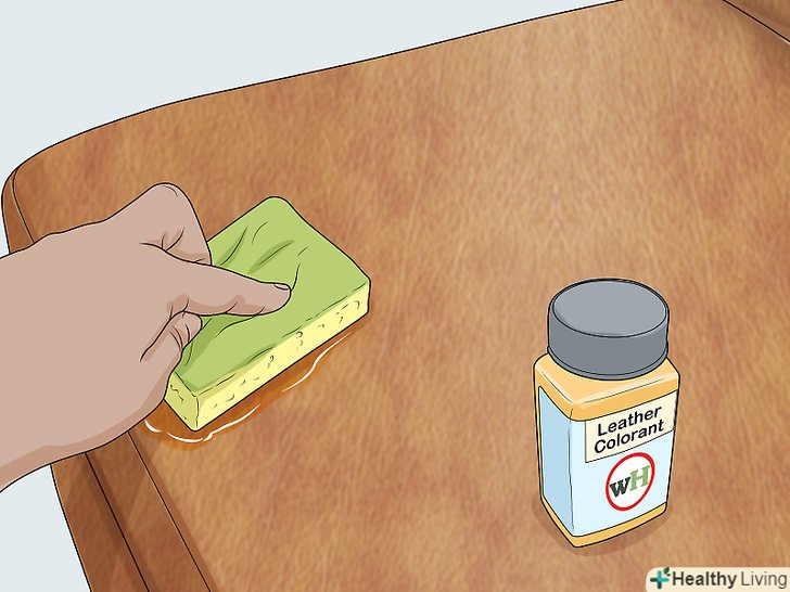 Скористайтеся правильним відтінком барвника для шкіри. Тепер, коли пошкоджене місце було відновлено за допомогою заповнювача тріщин, вам необхідно пофарбувати цю ділянку шкіри, щоб він став однаковим за кольором з рештою її поверхнею. Нанесіть барвник на губку і рівномірно обробіть нею ділянку шкіри, покритий заповнювачем тріщин. [14]- Нанесіть стільки шарів барвника, скільки буде необхідно для того, щоб вирівняти колір меблів. Пам'ятайте про те, що кожен попередній шар повинен встигнути висохнути до нанесення нового шару барвника.