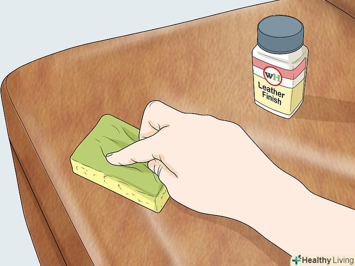 Покрийте забарвлену ділянку шкіри спеціальним лаковим покриттям. це дозволить захистити пофарбований заповнювач тріщин від появи на ньому нових подряпин. Нанесіть трохи лаку для шкіри на губку або чисту серветку, а потім легенько потріть нею забарвлену ділянку меблів. [15]- Щоб лакове покриття було стійким, нанесіть його в три-чотири шари.