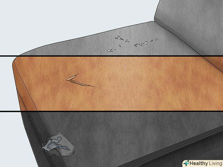 Визначте, яким видом шкіри обтягнута ваша Меблі. це можна з'ясувати при уважному огляді меблів. Так як різні види шкіри вимагають різного підходу до ремонту, дуже важливо першим кроком визначити вид шкіри, яким обтягнута меблі. Для виготовлення меблів зазвичай використовують три види шкіри: пігментовану шкіру, анілінову шкіру і спилок з поліуретановим покриттям. [1]- У переважній більшості випадків (близько 85%) меблі обтягують пігментованою шкірою. Така шкіра володіє міцною і стійкою до подряпин поверхнею, а також не вбирає в себе рідини.