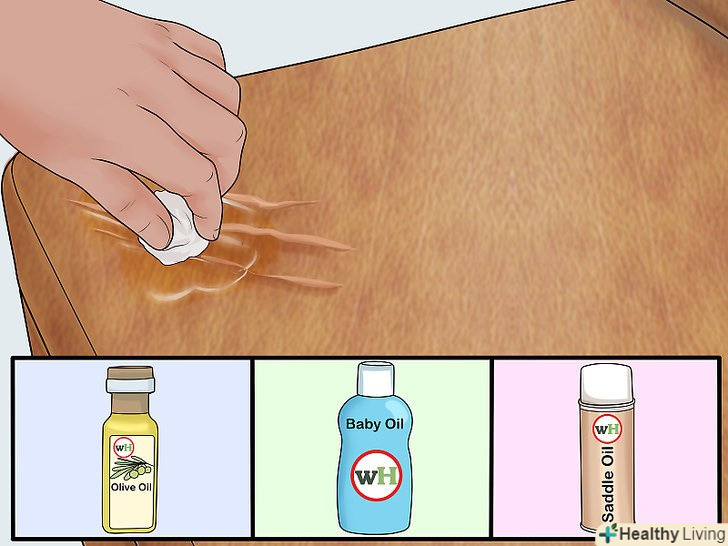 Втирайте в подряпину оливкова або дитяче масло, або спеціальне масло для шкіряних виробів. для цього скористайтеся ватною паличкою. Після нанесення масла прямо на подряпину, втирайте його в навколишнє шкіру круговими рухами. Потім залиште масло підсихати на одну годину, після чого зітріть його чистою ганчіркою. [5]- Якщо після першого застосування масла подряпина не затягнеться самостійно, спробуйте використовувати більше масла і залишити його на кілька годин для впливу.