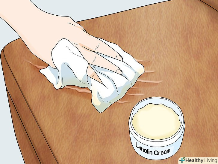 Обробіть подряпину ланоліном. візьміть чисту ганчірку, наприклад, бавовняну серветку, і занурте її в ланоліновий крем. Потріть серветкою подряпину перпендикулярними рухами по відношенню до її довжині. Це дозволить згладити і відновити місце подряпини, однак вам може знадобитися обробити подряпину кілька разів, перш ніж вона повністю зникне. [6]- Перевірте ланоліновий крем на непомітній ділянці меблів, так як він може викликати потемніння кольору шкіри.