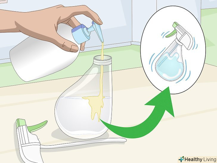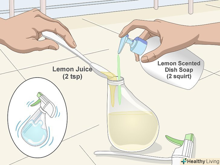 Додайте до складу лимонний сік і рідину для миття посуду, а потім добре струсіть. Перелив складу в пульверизатор, додайте до нього 2 чайні ложки (10 мл) лимонного соку і 1-2 мл рідини для миття посуду з лимонним запахом. Сильно струсіть пульверизатор, щоб ретельно перемішати всі компоненти. [10]- Лимонний сік можна замінити соком лайма або апельсина, але при цьому сік обов'язково повинен бути свіжовичавленим.