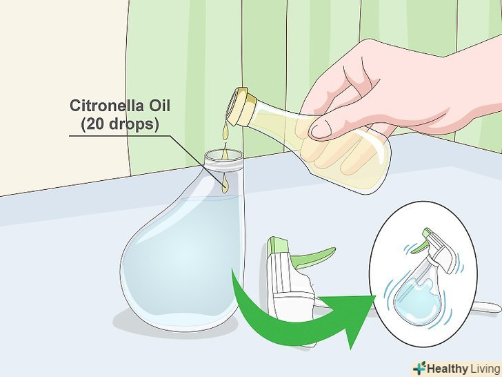 Додайте у воду ефірну олію цитронелли і ретельно струсіть пульверизатор. заповнивши пульверизатор водою, додайте в неї 20 крапель ефірного масла цитронелли. Добре струсіть ємність, щоб змішати масло з водою. [13]- Аналогічно цитрусовим і деяким іншим ефірним оліям, ефірна олія цитронелли має дуже сильний аромат, який відлякує кішок. Цей аромат також добре відлякує і комах.