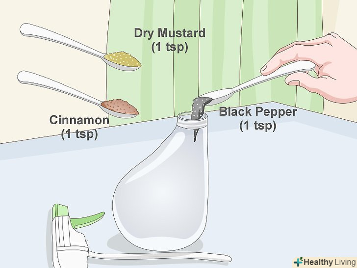 Насипте в пульверизатор перець, гірчицю і корицю. щоб приготувати репелент, вам буде потрібно скляний пульверизатор об'ємом 60 мл.насипте в нього 1 чайну ложку (2 г) чорного перцю, 1 чайну ложку (2 г) сухої гірчиці і 1 чайну ложку (3 г) кориці. [15]- Якщо хочете, чорний перець можна замінити кайенским.