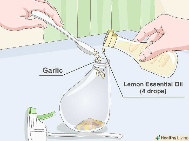 Додайте туди ж ефірне масло лимона і часник. насипавши в пульверизатор спеції, додайте до них подрібнений зубчик часнику. Потім капніть 3-4 краплі ефірного масла лимона і обережно струсіть вміст пульверизатора, щоб змішати інгредієнти. [16]- Свіжий зубчик часнику можна замінити ⅛ чайної ложки (0,5 г) часникового порошку.