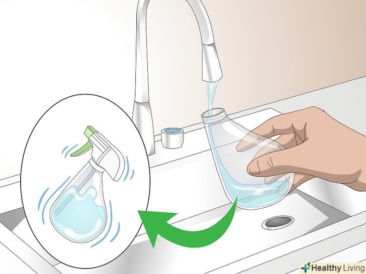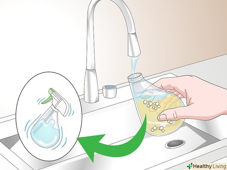 Наповніть пульверизатор водою і добре струсіть суміш. додавши в пульверизатор ефірні масла, наповніть його водою. Щільно закрийте ємність і сильно струсіть, щоб перемішати воду з ефірними маслами. [2]- Для приготування розчину аж ніяк не потрібно фільтрована або очищена вода. Вам цілком підійде звичайна вода з-під крана.