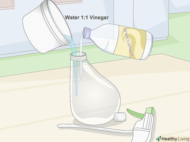 Налийте в пульверизатор оцет і воду. для приготування репеленту вам буде потрібно взяти пульверизатор. Налийте в нього 1 частину води і 1 частину оцту, а потім швидко струсіть, щоб змішати рідини. [4]- Щоб приготувати засіб, використовуйте білий винний оцет.