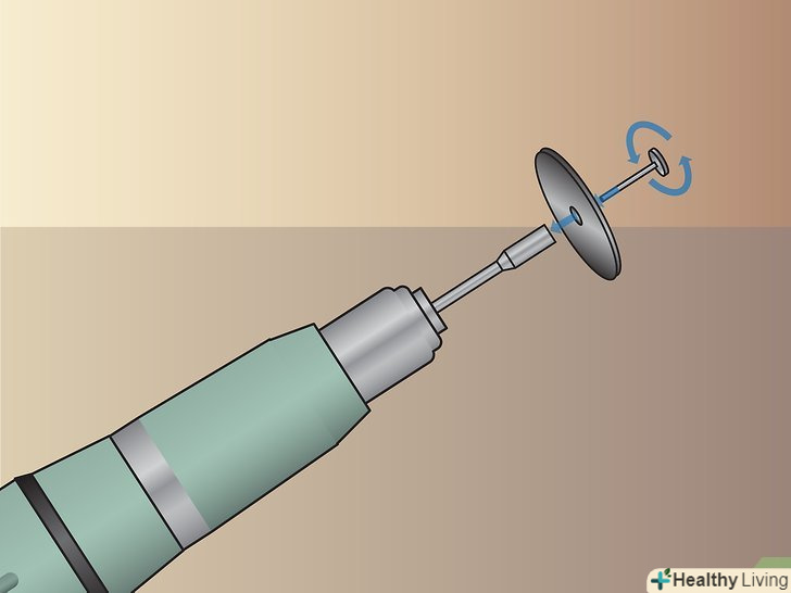 Встановіть наБормашину відрізний диск. Бормашина має знімні насадки. Їх можна змінювати в залежності від завдання, яку потрібно виконати. Щоб прорізати паз на капелюшку гвинта, вам знадобиться плоский диск по металу. Насадіть його на бормашину, дотримуючись інструкції виробника. [13]- Увімкніть бормашину, щоб перевірити, як вона працює. Диск повинен обертатися вільно з постійною швидкістю.