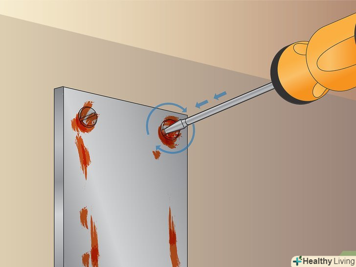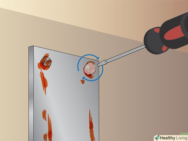 Якщо гвинт не піддається, нанесіть на нього розчинник іржі. рясно змочіть капелюшок гвинта розчинником. Поки рідина стікає, повертайте гвинт вперед-назад, щоб розподілити її по всій поверхні. Після цього у вас повинно вийти викрутити гвинт викруткою. [12]- Можливо, знадобиться змочити гвинт розчинником кілька разів, щоб він почав викручуватися. Постійно обертайте гвинт туди-сюди, щоб розчинник як слід роз'їв іржу.