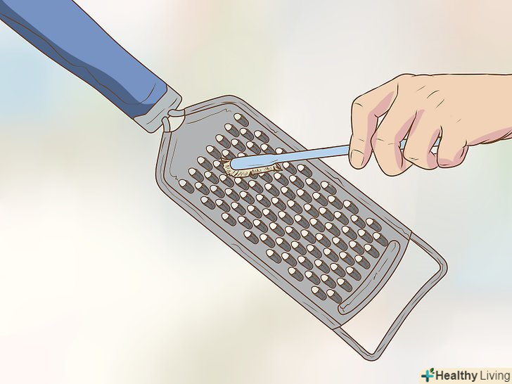 Видаляйте залишки сиру з терки. Розмір і форма зубної щітки дозволяють використовувати її для очищення всіх куточків і отворів терки для сиру. Зберігайте стару зубну щітку поруч з мийкою, щоб при необхідності очистити тертку. [7]
