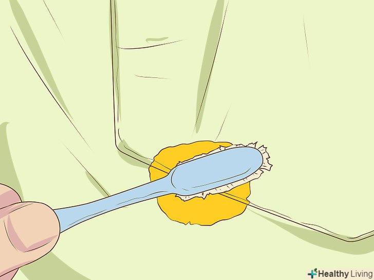 Чистіть білизну. зубна щітка дозволяє обробляти плями за допомогою невеликої кількості аерозольного або рідкого миючого засобу. Нанесіть засіб на пляму і м'яко обробіть круговими рухами за допомогою старої зубної щітки. [5]- Перед таким застосуванням особливо важливо переконатися в чистоті зубної щітки, оскільки наліт на зубній щітці лише погіршить забруднення. Переконайтеся, що щітка абсолютно чиста.