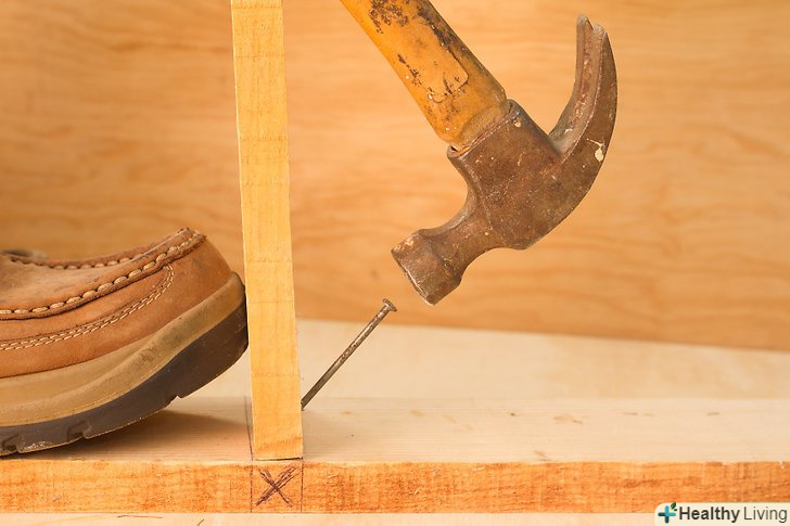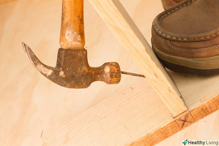 Розташуйте дошку перед лінією розмітки і помістіть цвях зі зворотного боку. почніть, забивши цвях приблизно на 6 мм прямо в дошку, не під кутом. Розташуйте дошку на відстані приблизно 6 мм від позначки, так щоб цвях був забитий в потрібній точці.