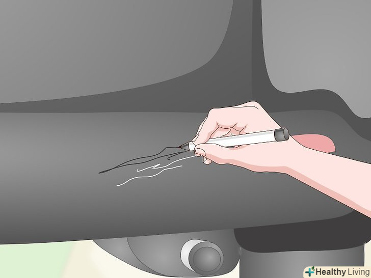 При необхідності використовуйте маркер для усунення подряпин. якщо подряпина досить глибока, спробуйте заповнити її маркером. Дізнайтеся точне кодування фарби на автомобілі (з керівництва користувача або мітки на автомобілі) і купіть маркер відповідного кольору в магазині автозапчастин (або замовте в Інтернеті). [14]- Проведіть маркером уздовж лінії подряпини, щоб нанести фарбу.