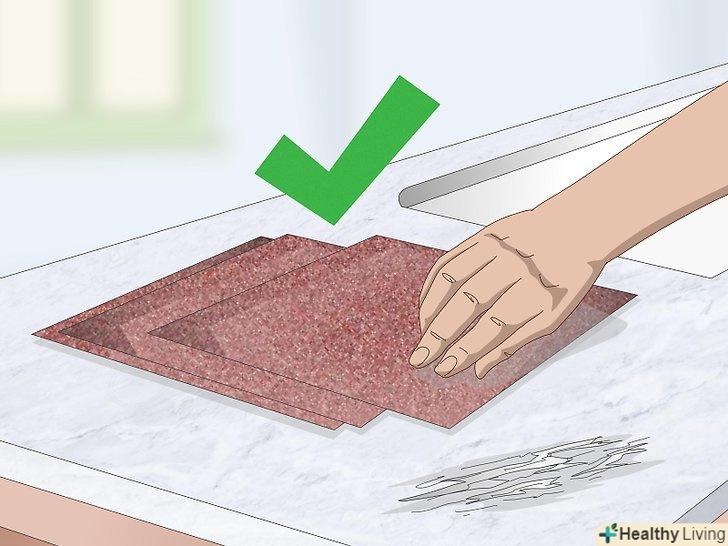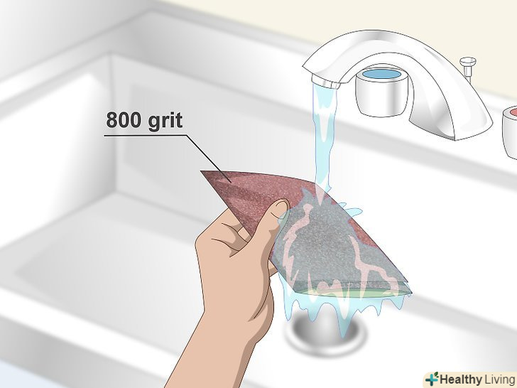 Для початку змочіть шкірку з зернистістю 800. Візьміть шматок наждачного паперу і складіть його втричі, щоб папір було простіше утримувати. Це також дозволить зменшити робочу поверхню. Нанесіть на наждачний папір трохи води. [6]- Обов'язково намочіть наждачний папір, щоб вона не стала занадто абразивною і вам було простіше прибирати пил і сміття під час роботи.