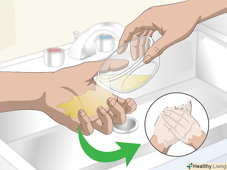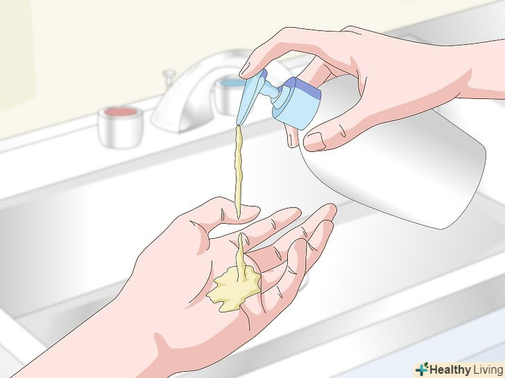 Обробіть руки миючим засобом для посуду. миючий засіб руйнує хімічні сполуки бензину. Налийте трохи миючого засобу для посуду собі в долоню. Його повинно вистачити, щоб покрити тонким шаром долоні і пальці. [11]