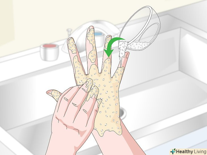 Посипте руки сіллю і розітріть руки. висипте сіль поверх миючого засобу. Розітріть руки, ретельно масажуючи долоні і пальці. Продовжуйте розтирати руки протягом хвилини. [12]