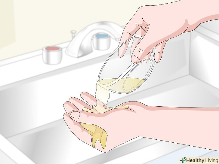 Вимийте руки під краном. коли закінчите розтирати рук, змийте оцет. Підставте руки під проточну воду і вимийте їх з милом. Мийте руки до тих пір, поки не перестанете відчувати запах білого оцту. Витріть руки рушником. [3]